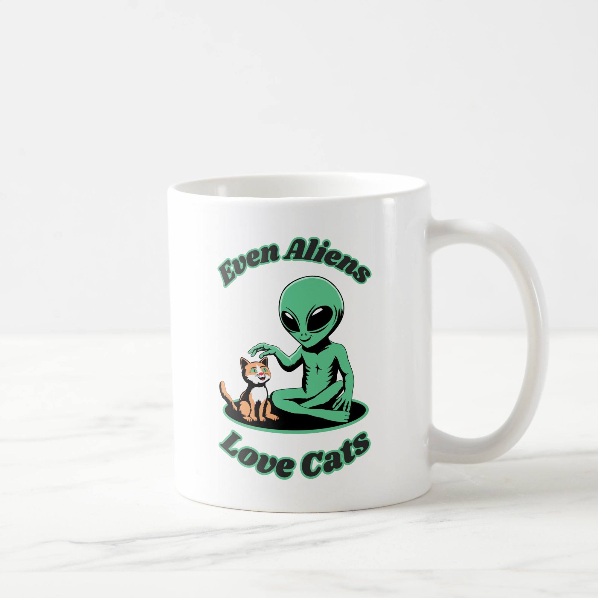 By purchasing our mug, you get not just a practical everyday item, but also a unique and humorous addition that brings joy and humor to your day. Imagine drinking your favorite coffee from a mug featuring an illustration of a smiling alien and a cat, and how that sight lifts your spirits. No matter where you are, our mug will always remind you of the love for cats that even transcends earthly boundaries.