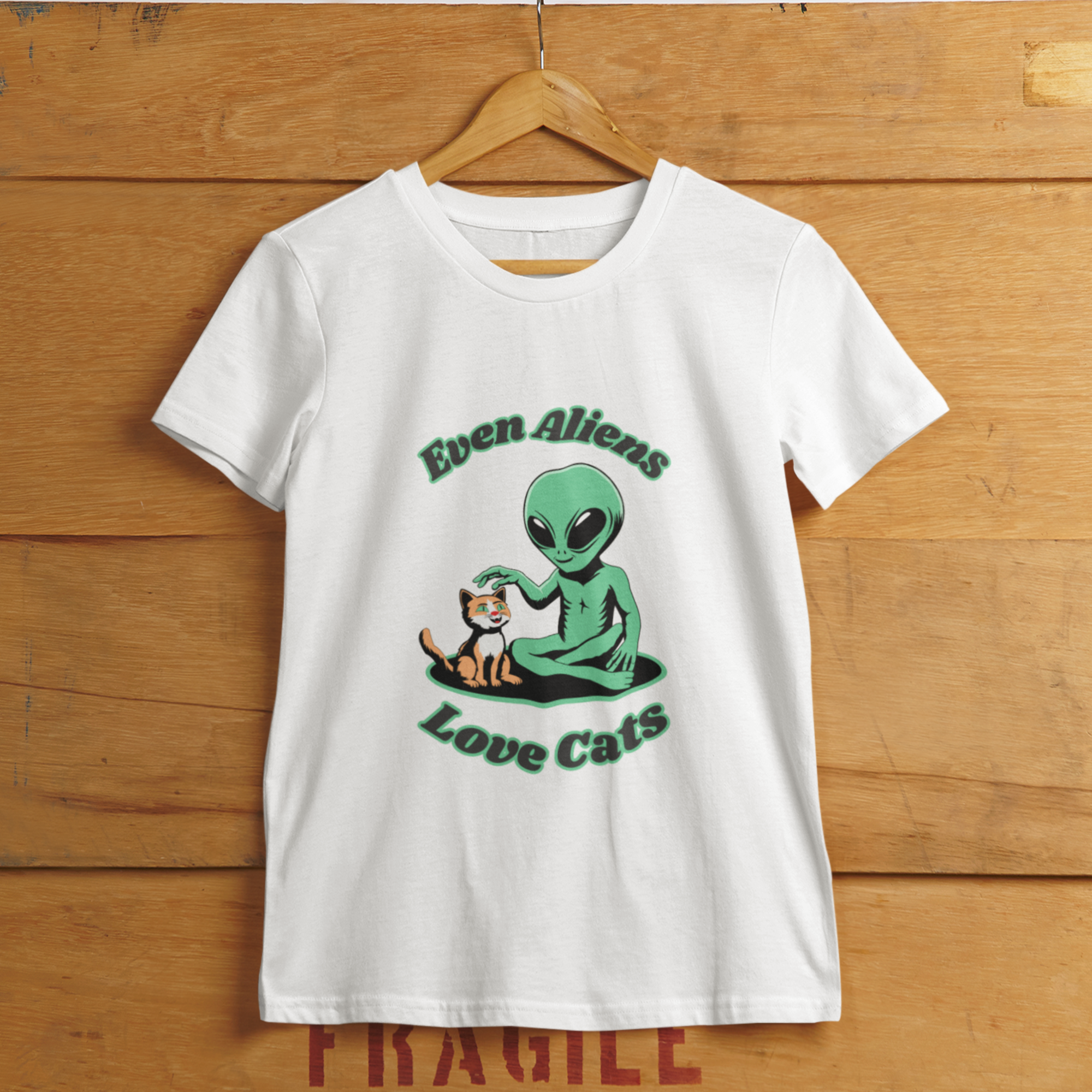 Women’s T-shirt featuring an illustration of a cat and an adorable alien admiring it. Our T-shirt, with the cute text ”Even Aliens Love Cats”, is the perfect choice for every cat and alien enthusiast. Made from soft cotton and offering a comfortable fit, it will make you feel at ease in any situation. Click the ”Buy Now” button and visit my store on Zazzle.